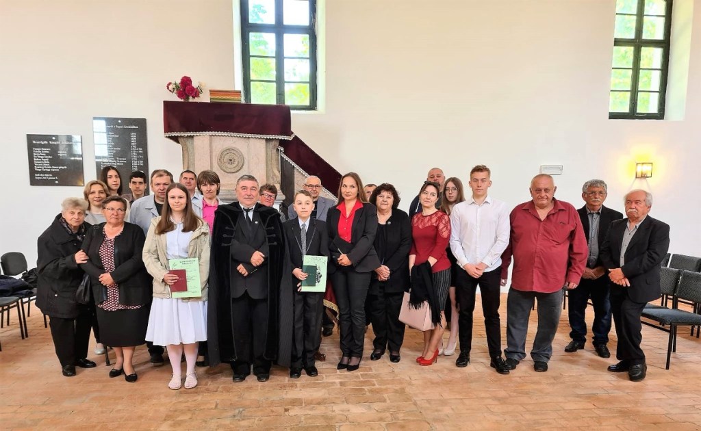 S nedavne konfirmacije u Kotlini. Župnik Đuro Varga s vjernicima. U pozadini se vide ploče s imenima župnika.