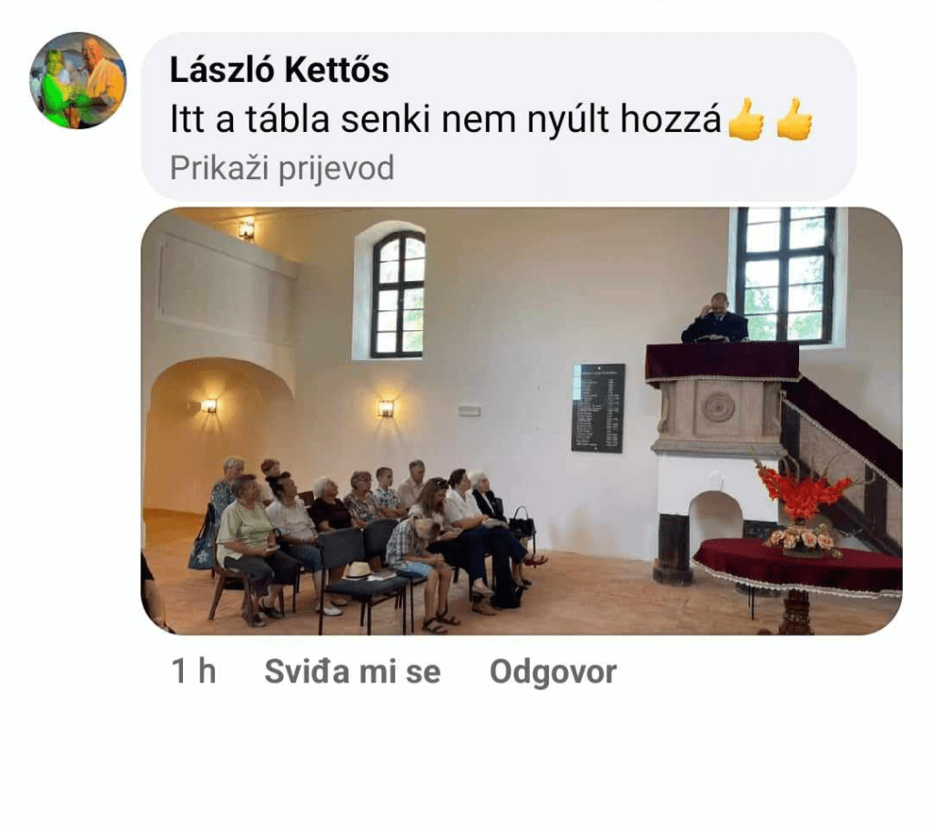 U međuvremenu je na fb stranici Reformatske kršćanske crkve Mađara u Hrvatskoj gospodin Laszlo Kettos (poznat s jedne snimke prilikom pokušaja nezakonitog ulaska u župnu crkvu u Kopačevu kako pokazuje neprimjerene znakove rukom biskupu Janosu K. Kettosu, inače svome rođaku koji se nalazio u župnom stanu) ostavio komentar s drugom fotografijom na kojoj se vidi da je ipak jedna ploča ostala.