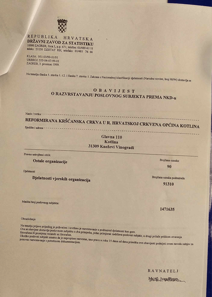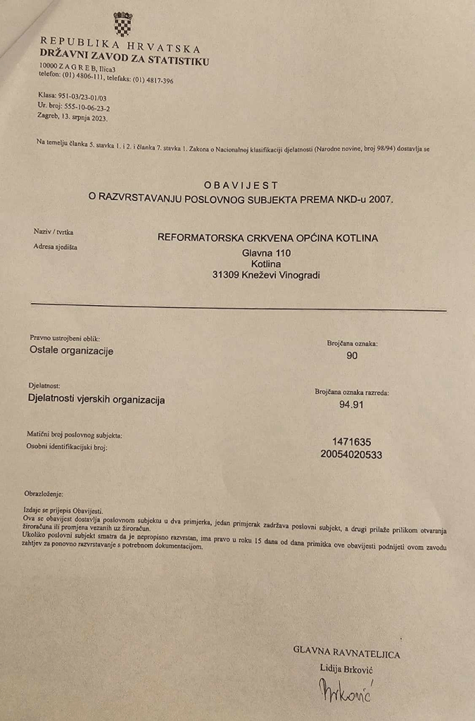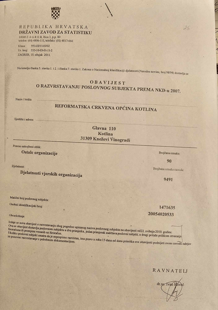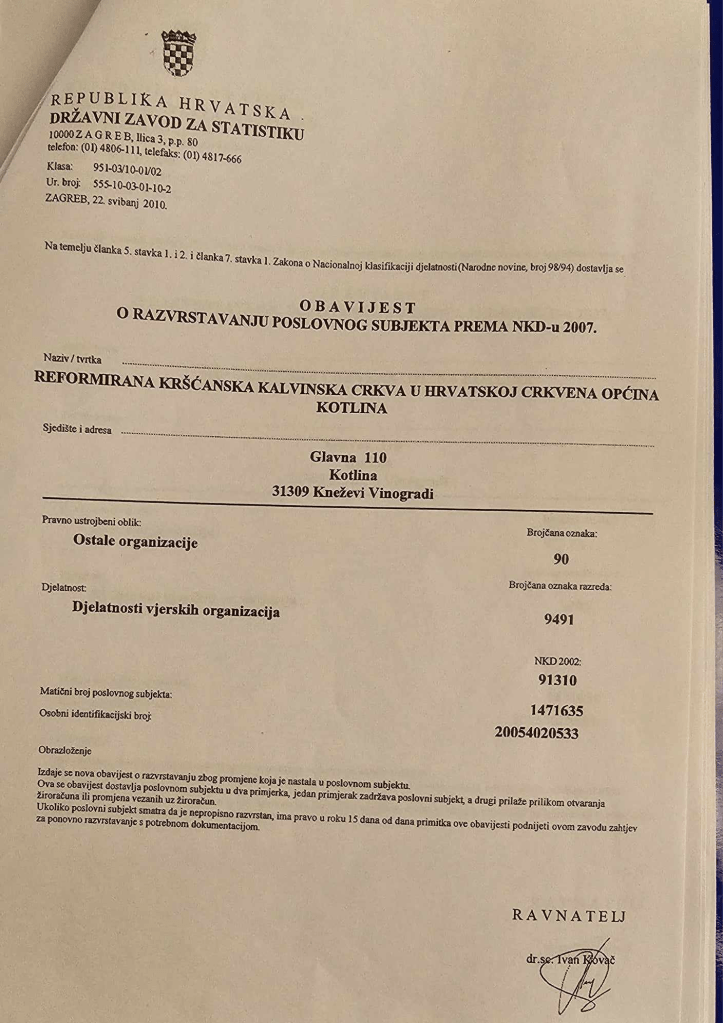 Naziv: Reformirana kršćanska kalvinska crkva u Hrvatskoj, Crkvena općina Kotlina, sjedište Kotlina Glavna 110, MB 1471635, OIB 20054020533. Dakle po podacima o sjedištu i MB, vidi se poveznica s ranijom Obavijesti Državnog zavoda na temelju koje je izvršena promjena 2002. godine rješenjem Z-1289/02.