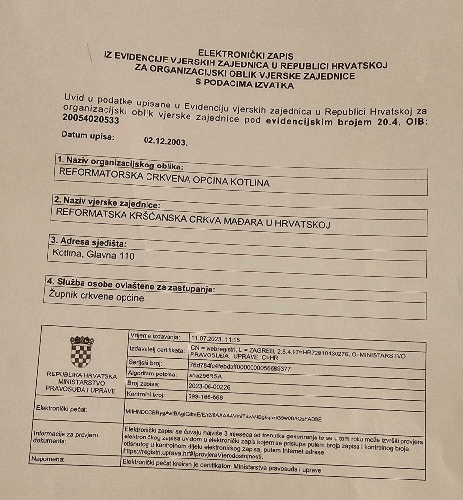 a) Vjerska zajednica imenom Reformirana kršćanska kalvinska crkva u Hrvatskoj sa sjedištem u Lugu, Crkvena 4, OIB 68677215945