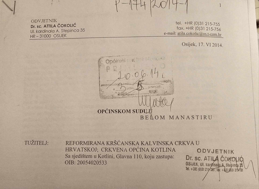 Nažalost, Reformatska kršćanska crkva Mađara u Hrvatskoj, odnosno njezina župa, Reformatorska crkvena općina Kotlina nisu znali da se vodi navedeni postupak pred Ustavnim sudom, te nisu obavijestili sud o pravomoćnoj sudskoj odluci po pitanju pravnog sljedništva.
