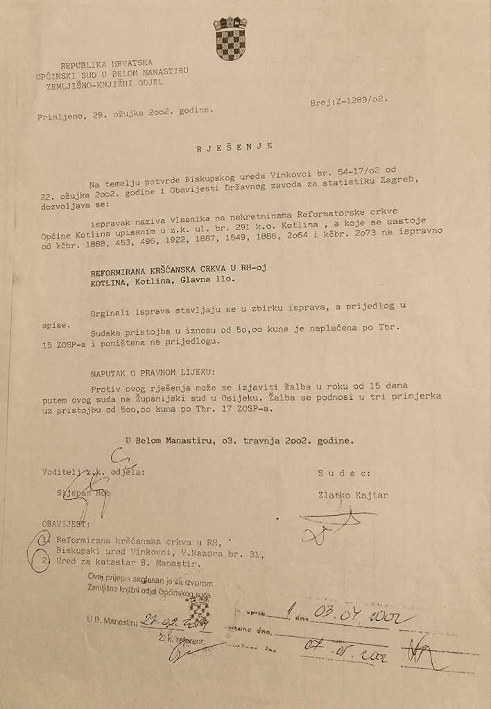 Rješenjem Z-1289/02 mijenja se naziv na Reformirana kršćanska crkva u R.Hrvatskoj, Župa Kotlina (tako je upisano u zemljišnim knjigama, iako u rješenju stoji samo Reformirana kršćanska crkva u RH, Kotlina. No, ono što je bitno je da u navedenom rješenju stoji da se ispravlja naziv vlasnika na nekretninama REFORMATORSKE CRKVENE OPĆINE KOTLINA. Dakle, nema sumnje koji je do tada naziv bio upisan u zemljišnim knjigama.