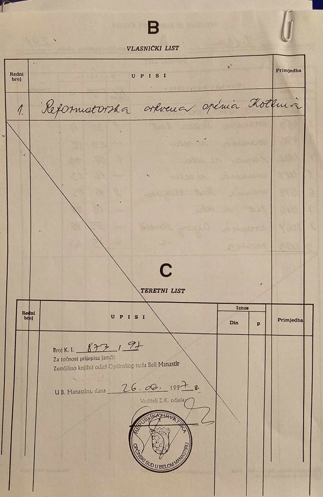 Godine 2005. Zemljišno knjižni odjel u Belom Manastiru u predmetu Z-4050, mijenja naziv vlasnika navedenog zk.ul. u Reformirana kršćanska kalvinska crkva u Hrvatskoj, dok istovremeno pravnoj osobi pod nazivom Crkvena općina Kotlina dozvoljava pravo uporabe (dakle, uporabe a ne vlasništva). U ovome predmetu se u zbirci isprava nalazi Obavijest državnog zavoda za statistiku klasa 951-03/10-01/02, urbroj 555-10-03-01-10-2 od 22. svibnja 2010. godine. U navedenoj Obavijesti nalaze se slijedeći podaci: