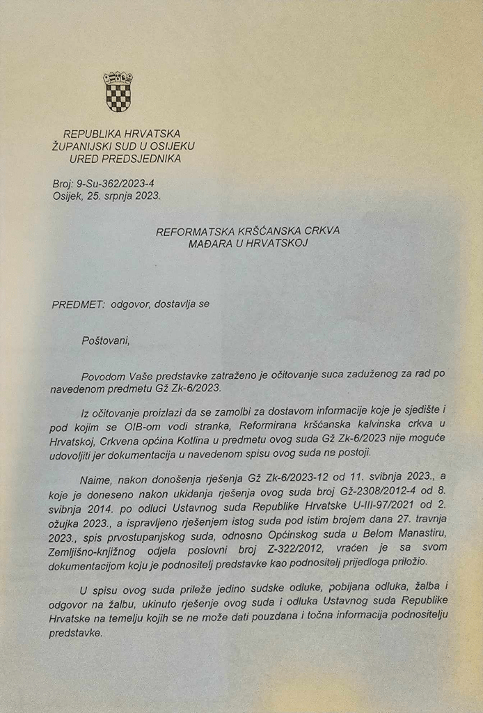 Sličan odgovor došao je i od strane Županijskog suda u Osijeku, koji je, na temelju rješenja Ustavnog suda donio novo rješenje kojim je Reformatska crkvena općina Kotlina ostala (vjerujemo privremeno) bez svoje imovine (Vidi više ovdje).