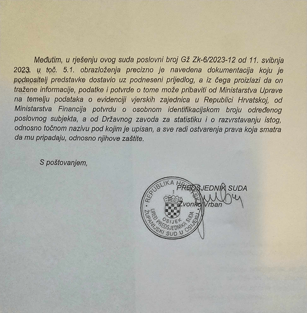 Nakon upita Reformatske kršćanske crkve Mađara u Hrvatskoj da joj se dostavi informacija koji je OIB i sjedište podnositelja gore navedene Ustavne tužbe, ista je dobila odgovor da Ustavni sud nema podatke o OIB-u te, sukladno zakonu ista nije niti morala dostaviti taj podatak. Ovo, iako je istinito, poprilično čudno zvuči, budući bez OIB-a danas ne možete ništa, ali možete podnijeti Ustavnu tužbi i čak je dobiti u svoju koristi, a da Ustavni sud ne provjerava postoji li podnositelj kao pravna osoba.