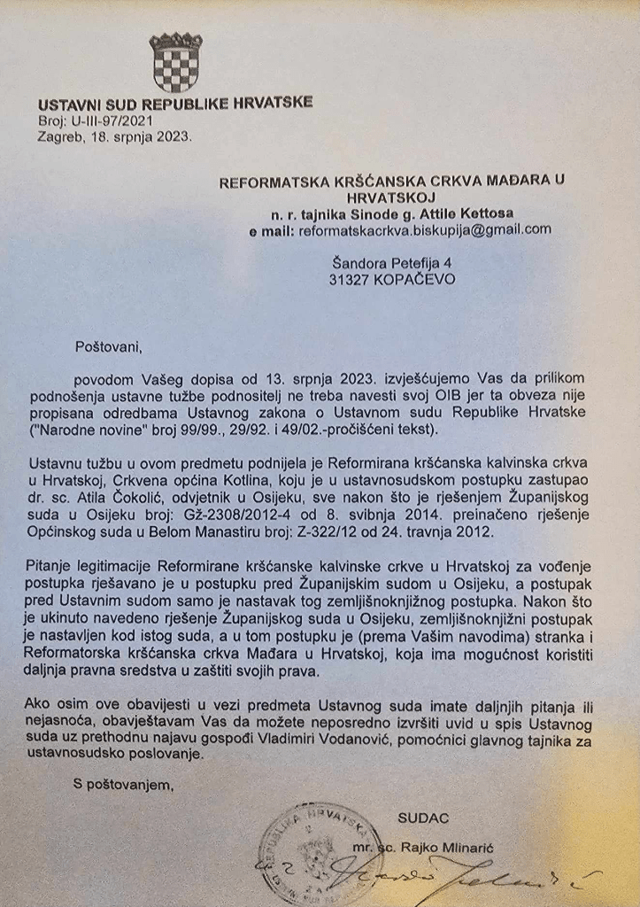 Već smo pisali o tome da je Ustavni sud Republike Hrvatske, u slučaju Reformatske crkvene općine Kotlina donio j dana 2. ožujka 2023. godine, pod brojem U-III-97/2021 odluku kojom se ukida Rješenje Županijskog suda u Osijeku Gž-2308/2021-4 od 8. svibnja 2014. godine i predmet vraća na ponovni postupak. O tome vidi više ovdje.